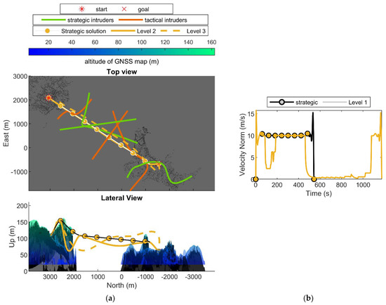 - Level 1 is aimed at modifying the time history of the trajectory without altering its geometry so as to keep the path optimality. Time history is modified by scaling down the UAV velocity using an ad hoc scaling function, which decelerates the vehicle before the encounter through a deterministic approach. Because spatial modification of the trajectory is not foreseen in this approach, Level 1 can be only used for avoiding mobile obstacle collision in the case of non-frontal confliction geometries. In addition, despite the low computational time, this approach extends the mission time and can be not suitable for vehicles whose nominal path requires an energy consumption close to the battery capacity.