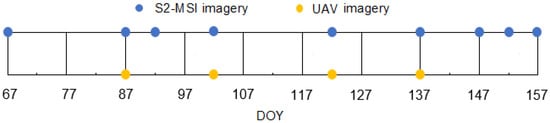 DOYs of UAV and S2-MSI imagery available during the monitoring period.