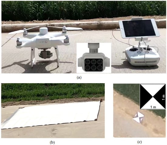 UAV system and ground targets: (a) UAV with multispectral camera and remote control; (b) standard reflective cloth; (c) GCP.