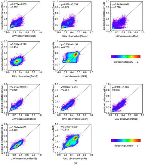Due to the different spectral response functions of multi-sensors, radiometric inconsistency is another major factor affecting the fusion accuracy, especially for UAVs and satellites with very different sensors, platform heights, and imaging conditions [33]. Therefore, it is necessary to minimize the radiation differences among multi-source imagery. We downsampled the UAV imagery to 10 m, comparable to S2-MSI, and established linear regression models for relative radiometric normalization.