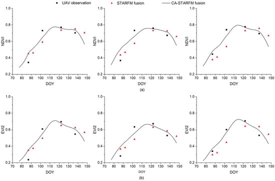 The introduction of the CACAO method makes it possible to generate imagery at arbitrary dates during the monitoring period, and the dense temporal data are particularly suitable for continuous vegetation monitoring. Three plots were randomly selected to explore the seasonal variation in NDVI and EVI2 generated from the STARFM and CA-STARFM blended imagery, and their differences from the actual UAV observations are shown in Figure 8. CACAO shifted the sequence preliminary predictions to adjust and optimize the predictions. In this study, the shift was set to a maximum of 10 days, so the time-series data generated with CA-STARFM were from DOY 77 to DOY 147. It is observed that both NDVI and EVI2 describe crop growth trends well. From the early jointing stage on DOY 77, leaves, stems, roots, ears, and other organs of winter wheat grow rapidly at the same time, and NDVI and EVI2 show a rapid increasing trend. Around the end of the jointing stage on DOY 114, which is the most vigorous stage, NDVI and EVI2 reach a peak. Then entering the heading-filling stage, winter wheat begins to age gradually, and NDVI and EVI2 show a declining trend. After about DOY 140, wheat ears and leaves turn yellow, and NDVI and EVI decrease rapidly. In general, the synthetic time-series VIs of SATRFM and CA-STARFM are consistent with the UAV observations, except on DOY 87when they were subject to a slightly larger overestimation. Moreover, the synthetic VIs of CA-STARFM are closer to UAV observations with smaller deviation and continuous temporal resolution. This indicates that CA-STARFM is competent to monitor winter wheat seasonal dynamics more accurately and intensively than the tested existing STF methods.