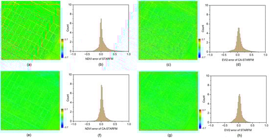 Error analysis of VIs. (a) spatial distribution of NDVI error of STARFM, (b) probability density distribution of NDVI error of STARFM, (c) spatial distribution of EVI2 error of STARFM, (d) probability density distribution of EVI2 error of STARFM, (e) spatial distribution of NDVI error of CA−STARFM, (f) probability density distribution of NDVI error of CA−STARFM, (g) spatial distribution of EVI2 error of CA−STARFM, (h) probability density distribution of EVI2 error of CA−STARFM. Reference system is WGS 1984−UTM 50 N. Representation scale is 1:700.
