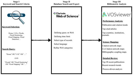According to its definition, the branch of study known as “bibliometrics” involves scholars analysing bibliographic records (i.e., published literature) using various statistical and mathematical techniques in order to spot significant trends and patterns [,,,]. Bibliometric studies are a type of research that uses quantitative methods to analyse and measure the impact and influence of publications. These studies typically aim to identify patterns and trends in the production, distribution and reception of knowledge, and to evaluate the relative importance and impact of different bibliographic factors (e.g., citations, authors, institutions, journals) [,]. One of the key aims of bibliometric studies is to provide a systematic and objective assessment of the state of a particular field of research. This is achieved by measuring the quantity and quality of relevant publications, and the extent to which they are cited and used by other scholars. This can help researchers, policy makers and funding agencies to identify areas of strength and weakness, and to make informed decisions about the allocation of resources and support. Another aim of bibliometric studies is to identify emerging trends and areas of growth in a field, by analyzing the changing patterns of publication and citation over time. This can help researchers to identify new opportunities and challenges, and to stay up-to-date with the latest developments in their field. Bibliometric studies can also be used to assess the impact and reach of individual publications, authors and institutions, by measuring the number of citations they receive, the journals in which they are published and the countries and institutions where they are cited. This can help researchers to evaluate their own work and to identify opportunities for collaboration and networking with other scholars [,]. Further, organizations can utilize this type of analysis to make decisions and evaluate the effectiveness of particular institutions, countries and periodicals. The VOSviewer [], BibExcel [], CiteSpace [] and Bibliometrix [] are some of the highlighted software tools used by the researchers to perform the bibliometric analysis. Drones have been identified as one of the trending technologies being utilized for flood monitoring and detection due to their capacity to provide an on-demand, larger perspective of the flooded region and map the degree of damage. The performed bibliometric analysis will facilitate the workers dealing with flood management and drone technologies in acquiring the important quantitative trends. Additionally, new researchers will benefit from identifying focal research areas and potential research directions. These evaluations can also help funding agencies identify possible institutions and locations where research in this topic should be fostered. Motivated by the significance and necessity of such an analysis, this work presents a comprehensive bibliometric review of the literature concerning the use of drone technology for flood monitoring, mapping and detection.