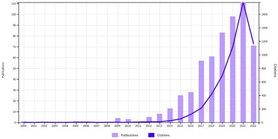 - Stage II: Database Search and Export: At the second stage, first, a database was identified and searched against the defined keyword query. For this research, we used the WoS database, which is one of the most comprehensive in the sciences and engineering domain. Bboth the WoS and Scopus are considered useful for performing bibliometric analysis; however, there are some key differences which influence the choice. One key difference is the scope of coverage by each database. WoS includes a carefully curated selection of high-quality, peer-reviewed literature, and Scopus covers a broader range of journals and other sources, including open access and non-peer-reviewed publications. As a result, there are high chances of having not-related literature entries when using Scopus, which may have a significant impact when the number of bibliographic records are less than 1000. Further, the WoS provides a range of citation-based metrics, such as the impact factor and the h-index, and tools for analyzing the relationships between papers, authors and institutions. Therefore, for the subject bibliometric analysis, we decided to use WoS with the objective of analyzing only high-quality, peer-reviewed literature to get the most significant trends in this domain [,,]. We defined the keyword query on the WoS and applied multiple filters based on the defined search criteria to refine the results. The time limit was defined based on the search criteria (i.e., 2000–2022); the type of records were set to articles, proceedings, review articles and book chapters; language was selected as English; and non-related WoS categories (e.g., economics, plant science, energy fuels, archaeology, mathematics, management, entomology, cybernetics, limnology) were excluded. As a result of the defined research query, in total, 561 literature records were extracted (dated 23 August 2022) and were exported to be analyzed using the bibliometric analysis tools.