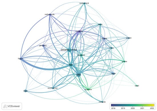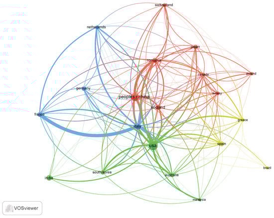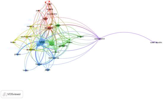 Each network map consists of nodes and links, where each node denotes an entity (i.e., country, author, document, journal, institution and keyword), and the link between two nodes denotes the co-occurrence relationship between those two entities. The weight of the represented entity is denoted by the size of the node, and the relationship strength is represented by the thickness of the link between two entities. The extent to which two entities are related to each other is represented by the distance between them, and the nodes’ colors categorize the entities into different clusters.