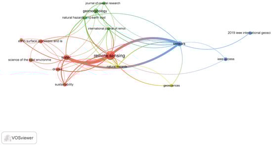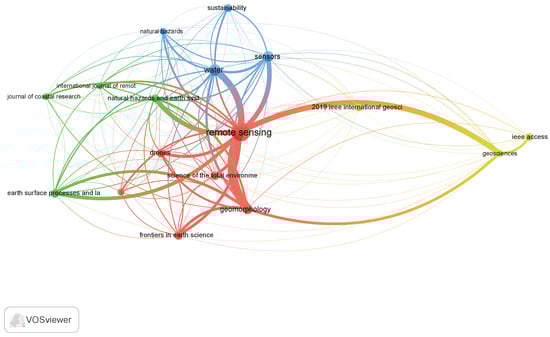 Figure 12 presents the network map based on the bibliographic coupling for journal. To generate the network map, a threshold of 5 was set for minimum number of documents by journal, which resulted in 17 institutions from a total of 335. In total, four clusters of journals were formed in the map. From two different clusters, the strongest bibliographic coupling was observed between Remote Sensing and Water, with the link strength of 206. On the other hand, from within the same cluster, the strongest bibliographic coupling was observed between Remote Sensing and Geomorphology, with the link strength of 281.