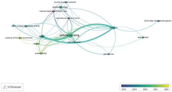 Figure 5 shows the citation-based network map for the journals. The map was generated using the threshold of five as a minimum number of documents from each journal. This rule resulted in 17 journals out of total 335. Remote Sensing (45), Water (17) and Sensors (14) are highlighted as top journals with the highest numbers of documents. The strongest citation relationship for journals from two different clusters was observed between Remote Sensing and Sensors with the link strength of 13. The clusters grouped the journals together which cited the same references. Figure 6 shows the overlay network map to identify the journals which have published most recently. Sustainability, Drones and Science of the Total Environment were observed as the journals publishing state-of-the-art research in the domain of using drones for flood monitoring, mapping and detection.