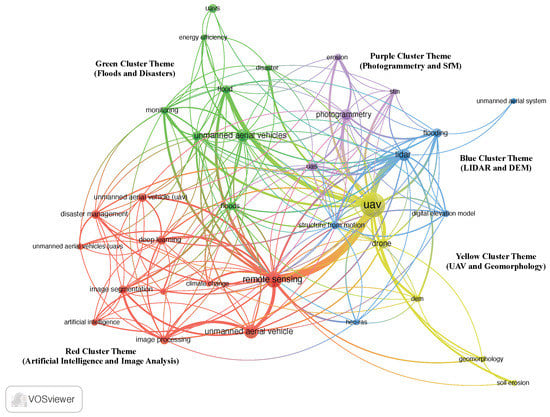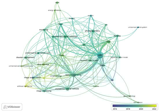 The keyword co-occurrence network map (see Figure 7) presents the relationships between different author-defined keywords based on how often those keywords appear together. For generation of a network map, the co-occurrence threshold for a keyword was set to a minimum of 6, which resulted in 34 keywords out of total 1830 author-defined keywords. The keyword “unmanned vehicles” has been mentioned in the literature with different names and cumulatively appeared as a top keyword. It had 217 occurrences (i.e., UAV (117), UAVs (13), unmanned aerial vehicle (51) and unmanned aerial vehicles (36)). Other highlighted keywords included remote sensing (49), floods (40), drones (33), LiDAR (27), photogrammetry (23), deep learning (14), image processing (13), disaster management (13) and artificial intelligence (7). UAV and remote sensing are the two most commonly co-occurring keywords from two distinct clusters with the link strength of 15. In terms of relatedness, UAV and structure from motion are identified to be the most related keywords from two different clusters. It is also important to highlight the research theme of each keyword cluster (see Figure 7). It can be observed that the red cluster is focused on AI and image processing, the green cluster is focused on floods and disasters, the purple cluster is focused on photogrammetry and structure from motion (SfM), the blue cluster is focused on LiDAR and digital elevation models (DEMs) and the yellow cluster is focused on geomorphology and UAVs. To understand the recent trends of research in use of drones for flood monitoring, mapping and detection, an overlay map of keywords is shown in Figure 8. It can be observed that the focus of recent research is more on machine learning, deep learning, artificial intelligence, energy efficiency and climate change.