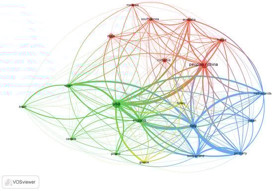 A citation network map for countries is presented in Figure 3. For network mapping, a threshold of 10 was used for minimum number of documents from a country. From the total of 81 countries, only 20 met the defined mapping criteria. The USA (115), China (82) and Italy (53) are the countries with the highest numbers of documents based on the node sizes. The strongest citation relationship between two countries belonging to different nodes was observed between the USA and Italy (i.e., link strength of 23). The clusters group the countries together which cited the same references.