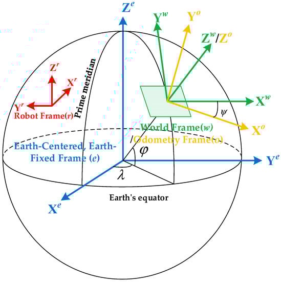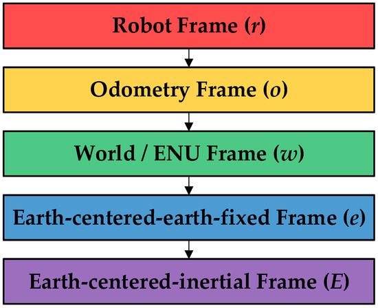The drone pose includes the current position and orientation in the world coordinate system. In our software development, the drone pose is represented by a 3D space point and a quaternion. We define (⁎)r as the robot coordinate system. (⁎)o is the odometry frame, where the direction of gravity is aligned with the Z axis. World coordinate system (⁎)w is a semi-global frame, where the X and Y axes respectively direct to the east and north direction, and the Z axis is also gravity aligned. The earth-centered, earth-fixed (ECEF) frame (⁎)e and the earth-centered inertial (ECI) frame (⁎)e are the global coordinate system that is fixed concerning the center of the earth. The complete frame transformation relationship is diagrammed in Figure 2, and the coordinate transformation tree is illustrated in Figure 3. The difference between the ECEF and the ECI frame is that the latter’s coordinate axis does not change with the earth’s rotation.