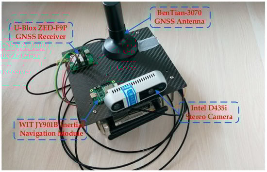 As exhibited in Figure 6, the equipment employed in our real-world position estimation experiments is a multisensor package with a stereo camera, a standard precision IMU and a GNSS receiver. The detailed descriptions of each sensor are shown in Table 2. The Intel RealSense D435i is a stereo camera with the addition of a BMI055 inertial measurement unit. Its field of view (FOV) exceeds 104 degrees, and the image sensor supports a global shutter. We utilize WIT JY901B inertial navigation module to provide raw inertial information. This inertial module has equipped with an MPU-9250 microchip, which can continuously output the raw IMU measurements at a frequency of 200 Hz. The u-blox ZED-F9P is a high-performance GNSS receiver with multi-constellation support, and it integrates real-time kinematics (RTK) technology in a compact encapsulation to acquire centimeter-level accuracy in an open-air scene. ZED-F9P offers support for a range of carrier ambiguity correction modalities allowing each application to improve navigation precision.