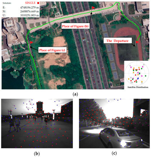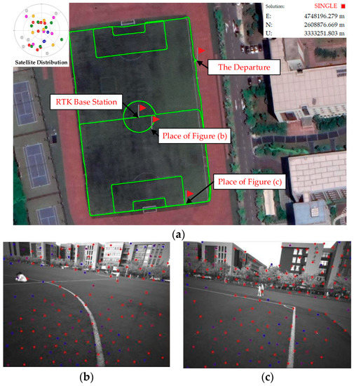 We put the RTK base station over the center of the soccer field. When the RTK status changes from “float” to “fixed”, we move along the soccer field sideline, midline and goal line in a straight line with the sensor equipment described in the Section 5.2.1. When encountering a corner, we rotate 90 degrees and continue to move along the marker line until we pass all the marker lines on the soccer field. The entire running situation is shown in Figure 8. The red points in Figure 8b,c are the Shi-Tomasi sparse feature points that have successfully completed KLT optical flow tracking, and the blue points are the Shi-Tomasi feature points, but no matching is found. In this experiment, the overall trajectory was 1km, and it took about 14 min to complete the whole journey. During this test the vast majority of navigation satellites are well captured, and the RTK mode keeps fixed throughout the whole experiment.