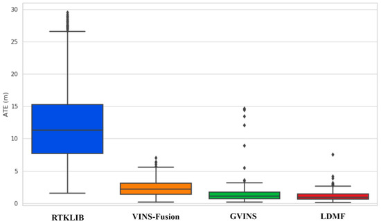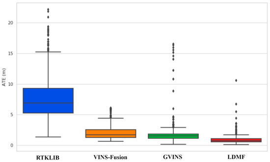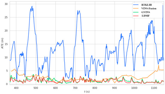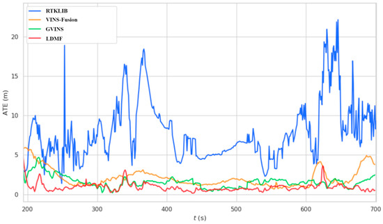 The proposed LDMF system is compared with RTKLIB [35], VINS-Fusion [28] and GVINS [10]. All assessments in this section are conducted on an NVIDIA Jetson Xavier NX embedded device as before. Table 3 shows the experimental results between LDMF and the other two methods, which are verified by an absolute trajectory error (ATE). There are four evaluation criteria in this test: namely, root mean square error (RMSE), median error, mean error and standard deviation. Figure 9 shows the superiorities of LDMF over other methods more intuitively than Table 3. The LDMF is superior to other methods in all performance criteria. Figure 10 shows the ATE of RTKLIB [35], VINS-Fusion [28], GVINS [10] and our system with respect to the running time. The positioning results from RTKLIB [35], VINS-Fusion [28], GVINS [10] and our system are compared directly against the RTK ground truth. As can be seen from Figure 10, the tightly coupled LDMF system outperforms other methods in the long distance. It benefits from the tight fusion of the global sensor, the cumulative error is limited to a tolerable range, and there is no drift over time. It is noteworthy that the LDMF system has an influential error at the initial stage, which is caused by the asynchronous initialization in the sensor fusion process. The system first initializes the vision module, then integrates with the inertial module, and finally feeds into the navigation satellite information. The positioning error decreases gradually until the system is completely initialized.