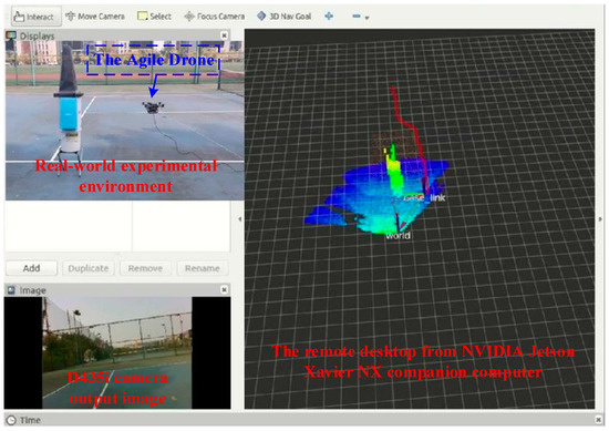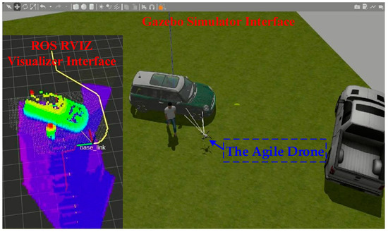 We carried out the virtual experiment for drone autonomous and safe navigation in the Gazebo simulator, as shown in Figure 14. After taking off, the aerial robot leverages a virtual plug-in camera, accelerometer, gyroscope and GNSS raw signal to obtain the relative relationship between the robot frame and the world coordinate. Meanwhile, a 3D environmental map calculated by a virtual plug-in camera is structured to further captured the transformation matrix between the aerial robot and the neighboring obstruction. When the flight destination is entered manually, the trajectory planner generates a path for the aerial robot motion and sends the desired speed to the flight controller, then gradually approaches the destination and keeps a fixed distance from the neighboring obstruction.