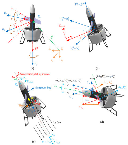 (a) Inertial and body-fixed frame; (b) other components during flight; (c) aerodynamic effects on the duct; (d) aerodynamic effects on the wings.