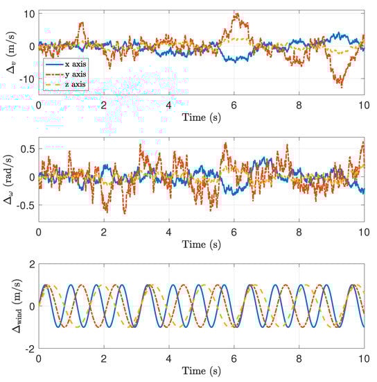 It is assumed that turbulence may also be present along with . Hence, the dynamics of total disturbances acting on the aircraft are defined as: