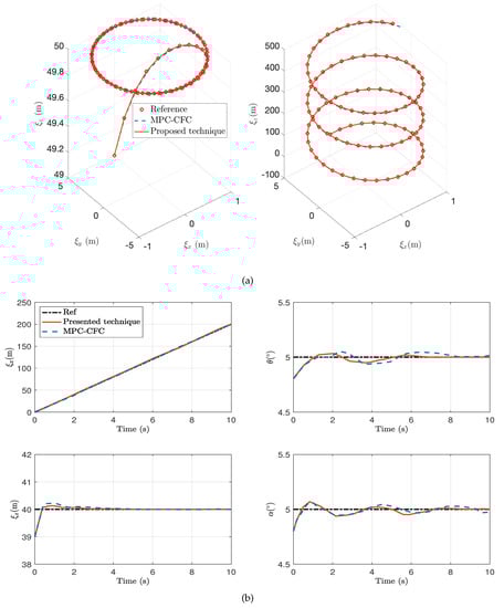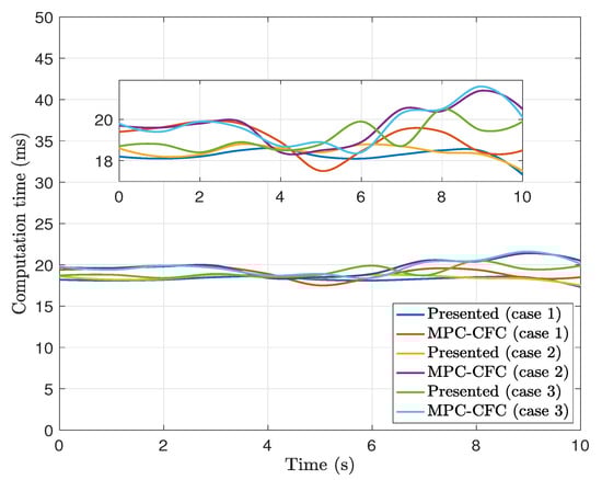 The numerical simulations are executed on Windows-driven Intel-based dual-core processor (2.2 GHz) with 8 GB of RAM. The optimization Problem 1 is written in MATLAB 2021a via CasADi [48], 3.5.5 version, and computed by NLP solver IPOPT [49], 3.12.3 version. The computational cost of these schemes is determined by the time required to compute the control action during the trajectory tracking response, depicted in Figure 9. Based on these findings, the average normalized computational time for the entire simulation study for the developed algorithm and MPC-CFC strategy is 18.62 ms and 19.51 ms, respectively.