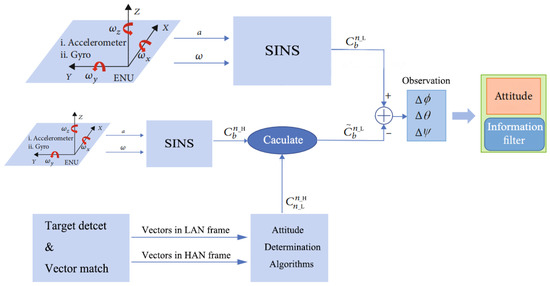 5] proves that although IMU-based LANs could improve their positioning accuracy by CN, the attitude estimation would be divergent because the motion equation of the IMU-based unmanned platform is highly nonlinear and the higher-order term is always neglected in the Taylor expansion. The error of attitude cannot be well compensated and affects the filter, leading to the deterioration of the CN performance of the whole swarm. To solve this problem, a new method was needed to obtain the relative attitude then calculate the optimal result of attitude estimation of LANs through filters using the output of IMU installed on the platform.