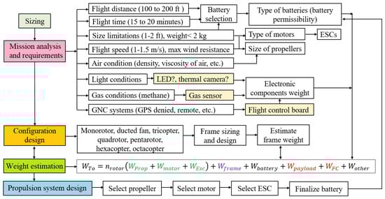 Sizing is one of the critical steps in the design process of different types of aerial vehicles, which results in the optimum values of their size and weights, and it consists of five steps [,,], including (1) mission definition, (2) flight modes, (3) configuration and shape, (4) weight estimation, and (5) propulsion system design []. In the mission definition, initially, the needs analyses are carried out. Considering the drone’s permissibility, safety, durability, functionality, and objectives, the kinematic requirements, flight time, cruise speed, etc., will be determined. After that, flight modes (hovering and forward flights) and the shape of the drone are determined based on application requirements. Then, analyses are conducted to extract the flight’s kinematic and dynamic equations, which result in the appropriate thrust loading of the drone. In parallel, different weight estimation methods can be employed. The outcome of the sizing process will be the geometry and dimensions of an intrinsically safe drone and the calculation of aerodynamic parameters. The optimum weight and dimensions of the drone and the components of the propulsion system, such as the battery, motors, propellers, and ESCs, will be specified during the sizing process []. In Figure 1, the proposed sizing process for the mono/multi-rotor drone with applications in underground coal mines is shown.