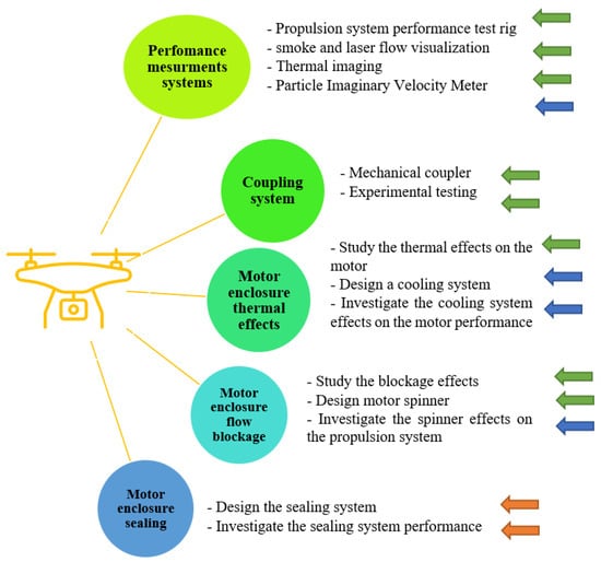 The current paper’s research began with the creation of a testing setup. A performance test rig for propulsion systems was built from scratch. The flow surrounding the drone propulsion system is visualized using a smoke generator and a laser generator. Furthermore, a thermal camera is utilized to visualize the thermal effect of the motor housing on the motor itself. After the trials are set up, the first research will look into the coupling effect on the propulsion system’s performance. After that, the thermal effects of the motor enclosure on the motor temperature and how this affects the motor’s temperature are investigated. In addition, a thermal problem solution is provided and evaluated. Finally, because the motor enclosure causes airflow obstruction, a motor spinner is created and tested experimentally.