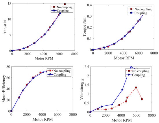 The test rig is used to compare the coupled and uncoupled propulsion systems, as depicted in Figure 8. Because the motor is not covered by its housing in this setup, only the coupling effect is evaluated. There is essentially little change in torque and thrust, as demonstrated in Figure 8. As shown, the uncoupled system has roughly 3% higher efficiency in the 2000 to 4000 RPM range, and the coupled system has around 66% more vibration. As the propeller moves away from the motor’s base, this rise is to be expected. Solutions to decrease these vibrations will be researched.