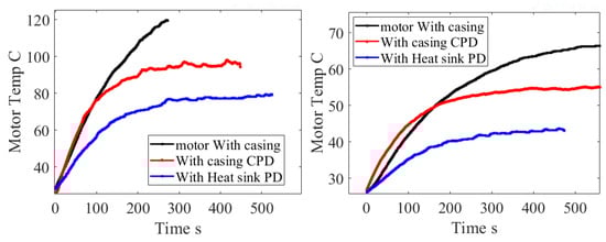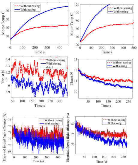 One of the most important tests is to explore the thermal effects due to having a motor casing on its performance. The motor could be destroyed if it exceeds a certain temperature. Therefore, the motor performance is tested in two conditions, one for the motor without a casing and the other with a casing, as shown in Figure 9. In this experiment, in both scenarios, the motor is operated at 50% (left) and 75% (right) of the maximum RPM, and the motor temperature is limited to 120 °C (based on the manufacturer data). During the testing, the motor without a casing reached 60 °C in about 425 s, while the motor with a casing reached this temperature in about 75 s for 75% of the motor RPM. Furthermore, the motor without a casing has smooth transition heating with almost a constant temperature of around 60 °C. Continuing this experiment without limiting the motor’s temperature could cause failure in the motor. Besides the safety point regarding the motor failure, the motor performance changes as the temperature increases, as shown in Figure 9, which illustrates the thrust and torque changes with increasing temperature.