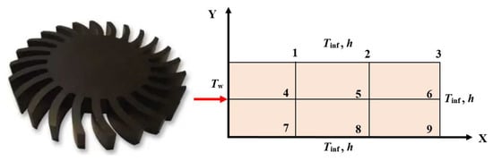 It is found that the heat sink shown in Figure 10 is available with multiple diameters; therefore, it is needed to calculate the required heat-sink geometry. The thermal resistance is calculated by Equation (2). Based on this equation and the data sheet of the heatsink, a heat sink with a 15 mm fin and 10 mm height is considered. It should be noted that the heat-sink core will cover the motor base. It is desired to calculate the heat-sink fin temperature distribution; Therefore, one fin is considered, as shown in Figure 10. To evaluate the fin length, a 30 mm fin is also assessed and compared with the basic fin. The boundary conditions, forced convection for fin faces, and wall temperature for the fin base are shown in Figure 10. It is assumed the fin base has a uniform temperature, which is 120 °C based on the previous motor temperature measurements.