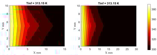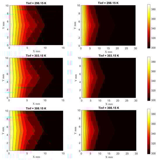 Heat-sink fin temperature distribution for Tw = 393.15 K and various Tinf, 15 mm fin (left) and 30 mm fin (right).
