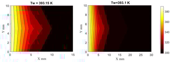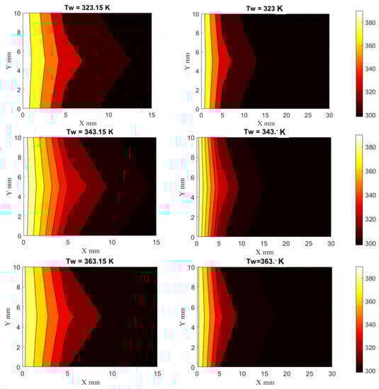 Heat-sink fin temperature distribution for Tinf = 298.15 K and various Tw, 15 mm fin (left) and 30 mm fin (right).