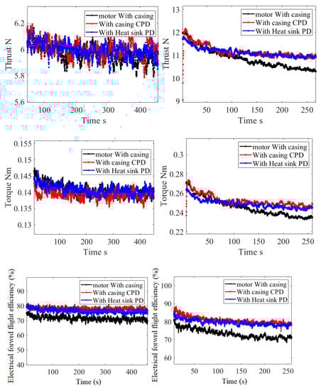 In addition to the propulsion-system measurement in the previous section, a thermal imaging experiment is also conducted. A time ratio of τ is introduced to compare the different test scenarios, as shown in Table 1. The time ratio is the ratio between steady-state or final temperature and instantaneous time. Four scenarios are investigated in the thermal imaging experiment, the motor without casing, the motor with a casing, the system with the heat sink PD, and the system with the heat-sink CPD. The motor tip is on the right, and the motor base is on the left. The red color in the thermal contours was set as the maximum limit of the motor temperature. For the motor without a casing, the temperature of the motor base increases a little bit with the 50% RPM, and it is higher for the 75% RPM case. It also can be seen that the propeller is cooling the motor tip, which includes the coals and makes it cooler than the motor base. For the motor with a case, the motor tip is hotter. The heat sink could give the motor tip and base a similar temperature. Furthermore, it can be seen that the motor with PD heat sink had a lower temperature than the motor with CPD.