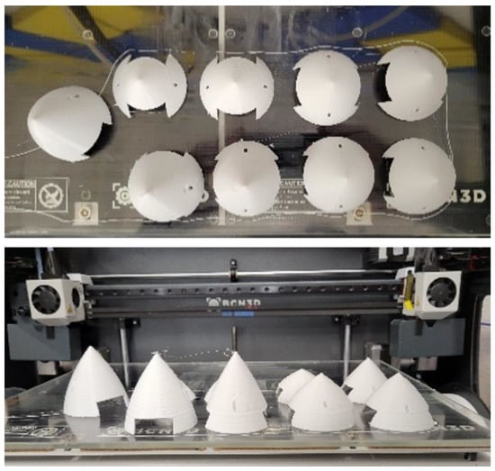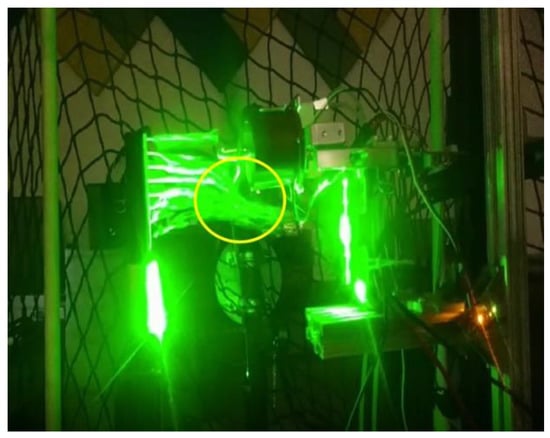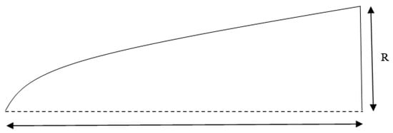 A smoke-visualization setup that applies a fog generator and laser is made to visualize the flow around the propulsion system, as shown in Figure 16. As can be seen, the flow is bent around the motor enclosure corner (the yellow circle), and that could reduce the system’s efficacy. To solve this problem, nine motor spinners, shown in Figure 17, are designed and prototyped. The spinners are tested using the performance test rig, and the performance of each one of them is evaluated. The spinner weight should be taken into consideration; however, for the current research, only the aerodynamic effects are considered. The spinner geometry is shown in Figure 18, and Equation (10) is used to design the spinner. In Table 2, the summary of different spinner equations, which all have the same diameter with different lengths and curve equations, are shown. Figure 19 compares the different spinners, and Figure 20 shows the 3d-printed spinners.