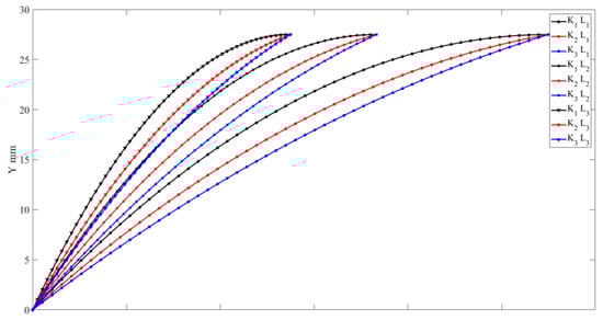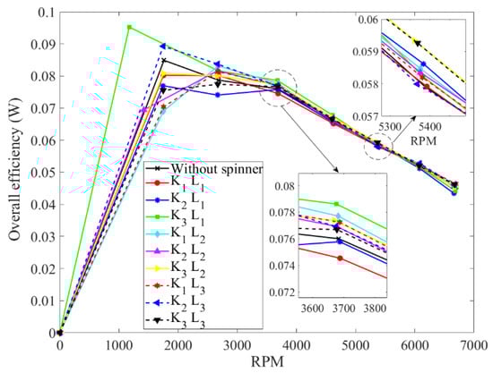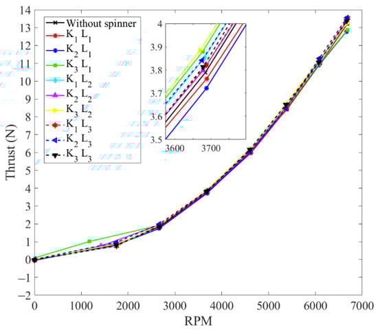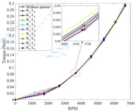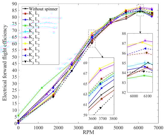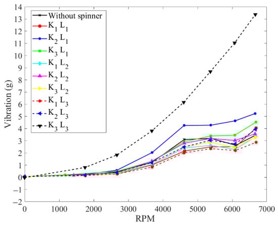 Each spinner is installed on the propeller, and the thrust from each of them is shown in Figure 22. From the thrust perspective, the K3L2 is the best choice. For the torque case in Figure 23, the difference is much smaller and will not considered in the selection. The slipstream velocity for K3L2 is the highest, as shown in Figure 24. Furthermore, from a propeller-efficiency point of view, K3L2, as indicated in Figure 25, has the highest efficiency. For the overall system efficiency, K3L1 is the highest, and K3L2 is in second place. Overall system efficiency for the different spinners is shown in Figure 26. The vibration results in Figure 27 indicate the success in balancing the spinners, but the spinners K2L1 need to be rebalanced if it will be used further, as it shows a higher level of vibration compared with the other spinners. Based on the previous analysis, K3L2 is selected.