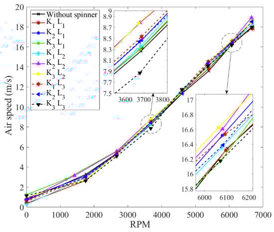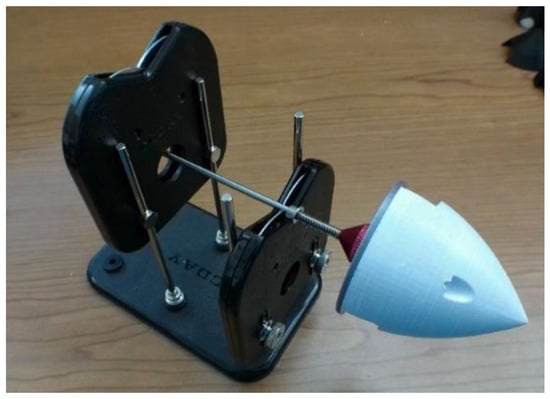 A balancing system shown in Figure 21 is used to balance the spinners before testing and reduce the operation vibration. Increasing the vibration could lead to breaking the motor’s shaft. Figure 22 presents the difference in airflow between the casing without a spinner and the casing with a spinner case.