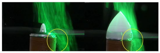 The smoke-visualization experiment for the case with and without a spinner is shown in Figure 28. As shown, the flow field with yellow is different in the two cases, especially the region with a yellow circle. Further measurements should be considered to evaluate the effect of these spinners on the thrust and torque. Moreover, the added weight should be taken into consideration.