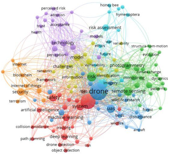 The articles in this map reflect the dual directions of research on this topic, the organizational and standardization one (e.g., framework, risk assessment, perception, acceptance, monitoring) and the technical implementation thereof (e.g., vulnerability, path planning, collision avoidance).
