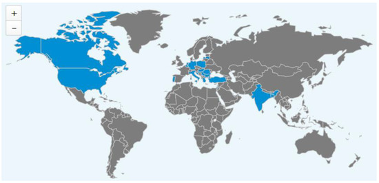 Distribution of respondents from a geographical perspective (blue represents the countries of the responders). Source: QuestionPro; analytics derived from the questionnaire and provided by the authors.