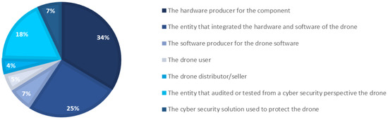 In terms of hardware security, H3 was invalidated, as the respondents viewed the hardware producer as primarily liable (34%) and not the integrator (25%). In addition, H4 was validated, as stakeholders early on the drone lifecycle were considered responsible for setting in place proper preventive measures against malfunctioning and/or user actions, starting from the producers of components and up to the entity auditing the drone before it is released on the market. This also shows the important role of independent stakeholders verifying certain security and safety features of products. From a technical and organizational perspective, this entails the need for standardized proper verification mechanisms to be implemented by independent third parties, which can entail a black-box analysis or a grey box analysis (or even a white-box analysis). A grey or white box analysis can lead, from a technical perspective to a more comprehensive analysis and results reflecting the actual full status of the drone at that point in time.