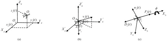Besides, we also assume that there are N UAVs in the formation and the reconfiguration process begins at time and ends at . Then, the state vector of the i-th UAV at time t can be expressed as , where and . is the position of the i-th UAV in the ground coordinate system as shown in Figure 2a, is the barycenter. is the motion state of the i-th UAV, where is the module value of the speed, is the flight-path angle and is the heading angle as shown in Figure 2b. The three axes in are parallel to the axes in the ground coordinate system , respectively. Then, the motion equations of the i-th UAV can be written as [7,27]