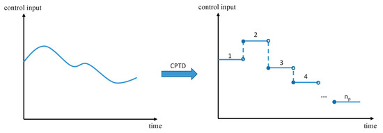 where and . Time t is still a variable of the Equation (21) since the CPTD method is used only to discretize the value of the control input as Figure 3. Therefore, the motion equations of (21) are still continuous in the time domain during each time segment.