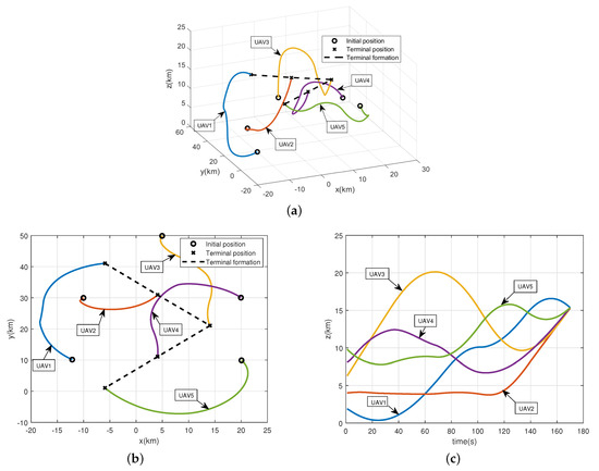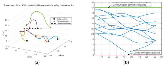 Figure 6 shows the procedure of the UAV formation transforming from the initial state into the desired V-shape formation. Figure 6a displays the trajectories in 3-D space obtained by the proposed approach. Different colors are used to distinguish the trajectories of different UAVs. “∘” represents the initial positions of UAVs, while “×” represents the positions of UAVs at the terminal time. The two dashed lines are the specified reconfiguration formation that the UAVs are expected to reach. It can be seen that the initial orientation of some UAVs are not directly heading to their desired positions. It is because the initial velocity direction of each UAV is arbitrary and our method successfully correct their paths and realize the formation reconfiguration in a short time. Furthermore, to illustrate the effectiveness of our proposed method more clearly. We demonstrate the trajectories in horizontal plane and vertical direction as Figure 6b,c. From the 2-D space, it shows that the final formation can satisfy the specified configuration formation “V”. In the meantime, we can conclude from Figure 6c that all the UAVs have successfully reached the same altitude at the terminal time. In summary, the proposed method can achieve the precise formation reconfiguration for the Multi-UAV system.