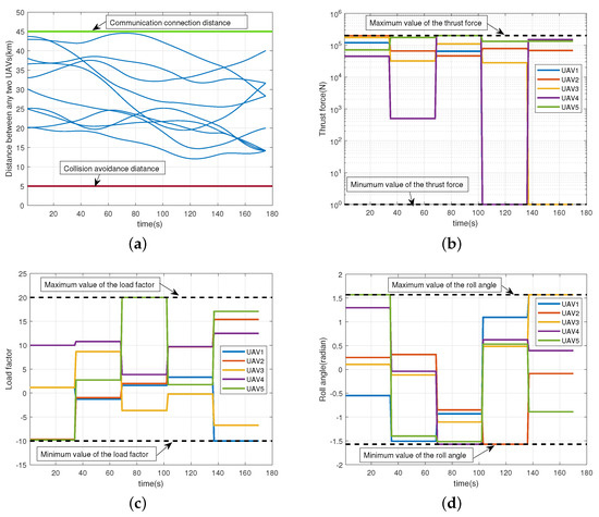 The constraints of the distance and the control inputs for the UAV formation. (a) The distance between any two UAVs. (b) The thrust force of the UAV formation obtained by modified ABC algorithm. (c) The load factor of the UAV formation obtained by modified ABC algorithm. (d) The roll angle of the UAV formation obtained by modified ABC algorithm.