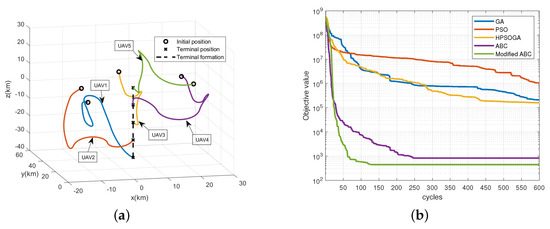 The simulation results for the formation reconfiguration of forming a straight-line shape with 5 UAVs. (a) The reconfiguration trajectories of the UAVs. (b) Objective function of the benchmarks.