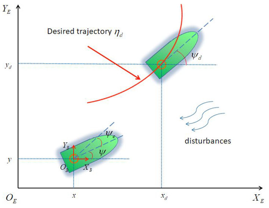 To simplify the design of the controller, we assume that the kinematics and the dynamics models of the AUV are symmetric, and the interference of the nonlinear dynamics model is taken into account. Taking AUVs as rigid bodies, we establish the following dynamic model in Figure 1, which depicts the reference frame for AUV path tracking in the plane: