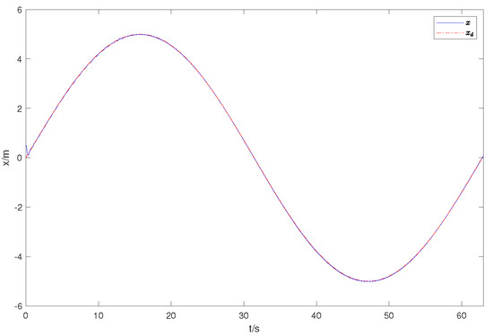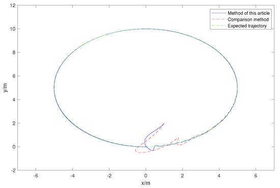 Further, an experimental comparison with [48] is used to demonstrate the effectiveness of our controller design. Here, we use a new initial position parameter m, m, and keep the other parameters unchanged. We illustrate the robustness of the controller design using root mean square error (MSE) calculations. Without considering the effect of input saturation, the designed controller outperforms the controller in [48] using the same starting point and the same parameters. The MSE in Table 3 represents the tracking performance of the two controllers. Figure 8 indicates that the two controllers have different tracking performance.