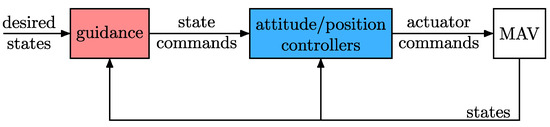Problem 1 is a nonlinear guidance and control problem of an underactuated MAV subject to disturbances and constraints, operating in a dynamic environment with multiple moving obstacles that can accelerate. To tackle this problem, we adopt the guidance and control architecture shown in Figure 1. The adopted strategy is to design the control module to provide robustness with respect to disturbances and uncertainties, and the guidance module to satisfy the position, velocity, and rotors’ thrust constraints while conducting the vehicle to reach the desired position and heading. The control and guidance methods are, respectively, detailed in Section 3 and Section 4. It is worth mentioning that the objective of Problem 1 can be immediately generalized for a sequence of desired positions and headings [3].