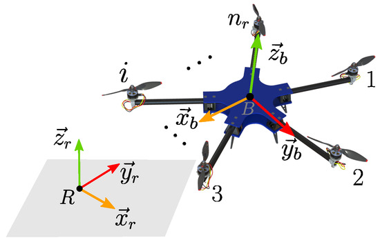 Consider an inertial reference CCS fixed on the ground at a known point R, with oriented upwards, parallel to the local vertical. Moreover, consider a body-fixed CCS located at a point B fixed to the MAV center of mass, as shown in Figure 2, along with an illustration of a general underactuated MAV equipped with fixed rotors parallel to .
