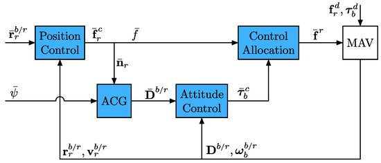 Most of the literature on underactuated MAVs [6,7,8,9,17,18,19,20,21] has designed the position and attitude controllers relying on a TSS between the (slower) position and (faster) attitude closed-loop dynamics, which allows us to nest the attitude control loop inside the position one, as shown in the block diagram of Figure 3. In this architecture, the position controller receives as the command input, and as feedback, and produces as the output. The attitude command generator (ACG) converts and into the three-dimensional attitude command . The attitude controller receives as the command input, and as feedback, and produces as output. Lastly, the control allocation converts and into individual thrust commands .