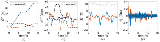 where , which in theory removes the underactuation of the system since the dependency of on the actual attitude is removed. Then, the attitude and position control laws can be separately designed by considering the resulting fully actuated system described by Equations (1), (4)–(6), and (12). The critical point is that, when using this strategy, the controllers’ gains have to be carefully tuned in order to respect the TSS assumption, whereas, in practice, this tuning is a cumbersome trial-and-error process, thus requiring improved safety procedures to deal with the eventual instability that may occur in the case of insufficient TSS [36].