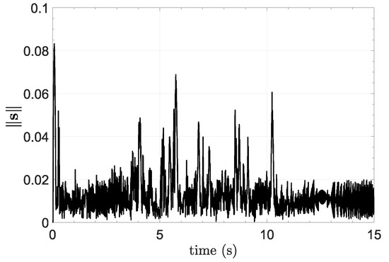 Figure 7 presents the position and attitude tracking performance as well as the force and torque control commands. In Figure 7a, it can be seen that the position commands are satisfactorily tracked despite the presence of the disturbance force. Figure 7b shows that the attitude commands are exactly tracked during the entire time despite the presence of the disturbance torque, thus confirming that by combining the proposed sliding mode attitude and smooth position control laws, an integral sliding mode exists in the attitude loop. This fact is also confirmed by Figure 8, which shows that the Euclidean norm of the attitude sliding variable is restricted to a relatively small neighborhood of the origin during the entire time. Figure 7c and Figure 7d, respectively, show the force and torque control commands. These plots confirm the smoothness and the switching behavior of the force and torque control commands, respectively.