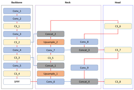 Figure 4. YOLO-v5s structure. The backbone extracts feature points, the neck improves the performance through convergence and interpolation of extracted feature points, and the head converts feature points into a bounding box. SPPF, Spatial pyramid pooling–fast.